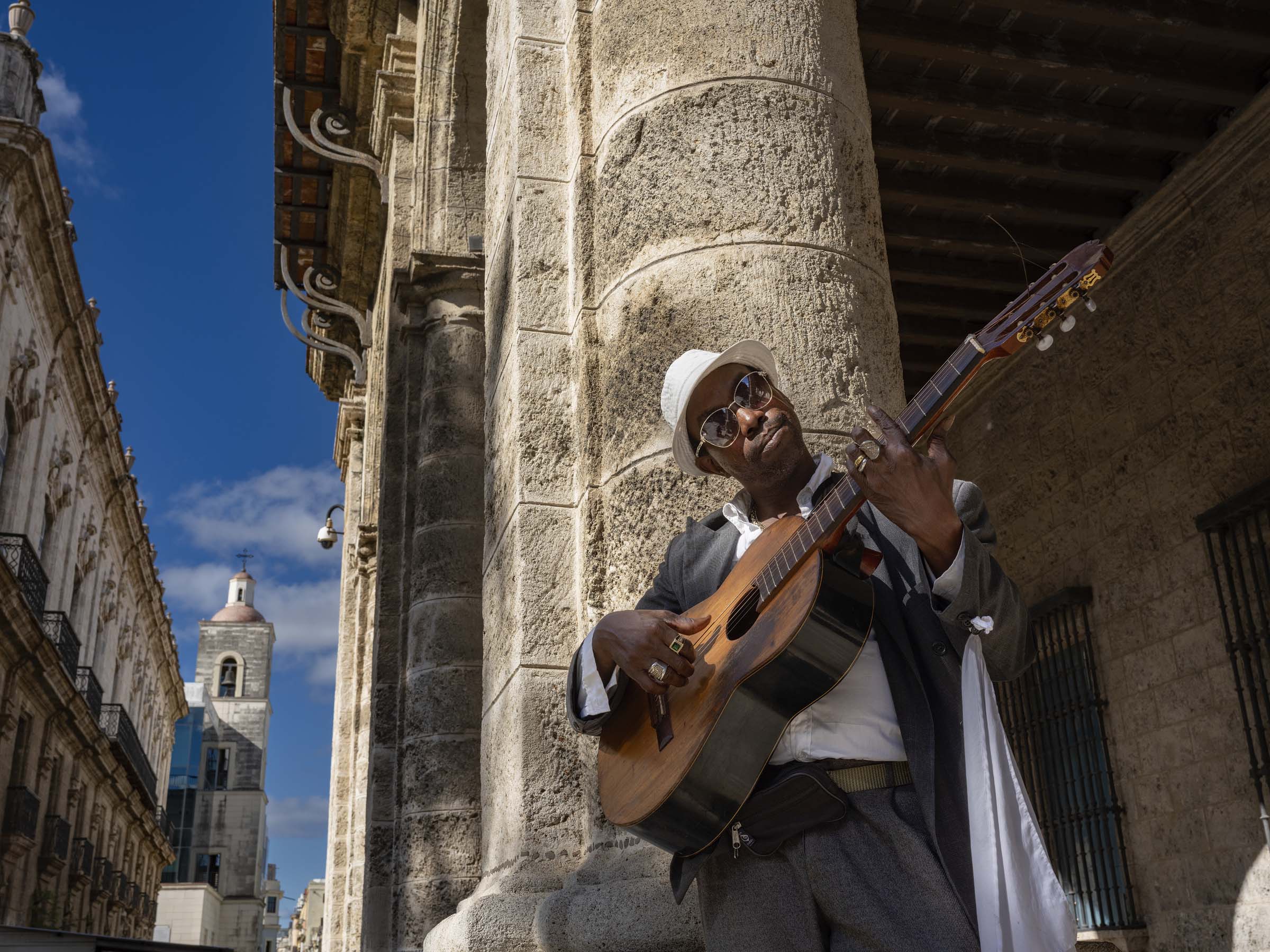 A street musician serenades visitors in Havana’s historic downtown district with classic Cuban songs.