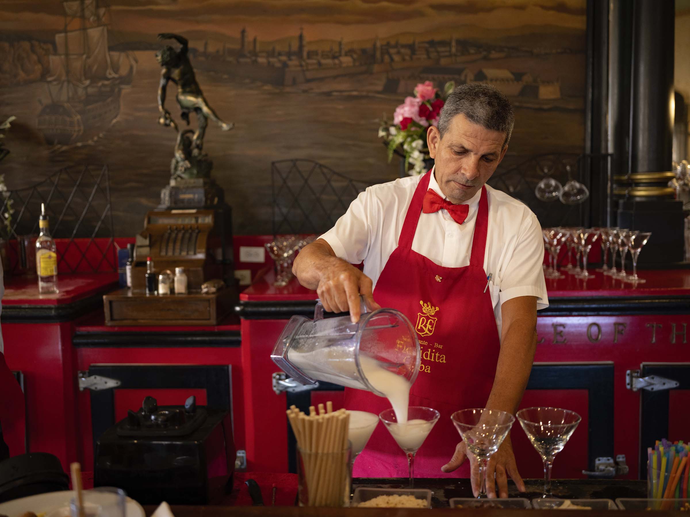 A bartender in the La Floridita pours a round of Papa Dobles, the bar’s signature cocktail.
