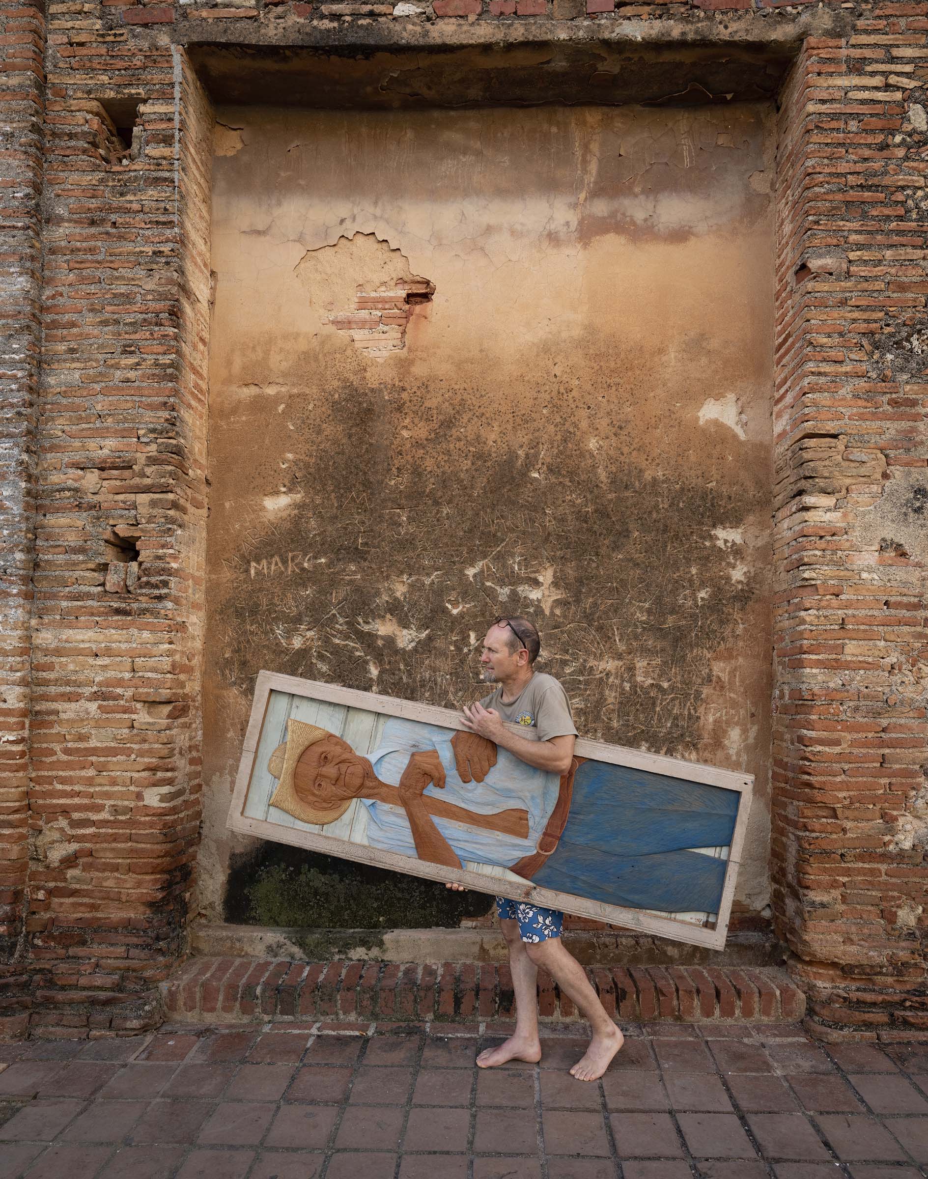 Trinidad artist Lazaro Niebla Castro outside his studio with one of his wood sculptures.