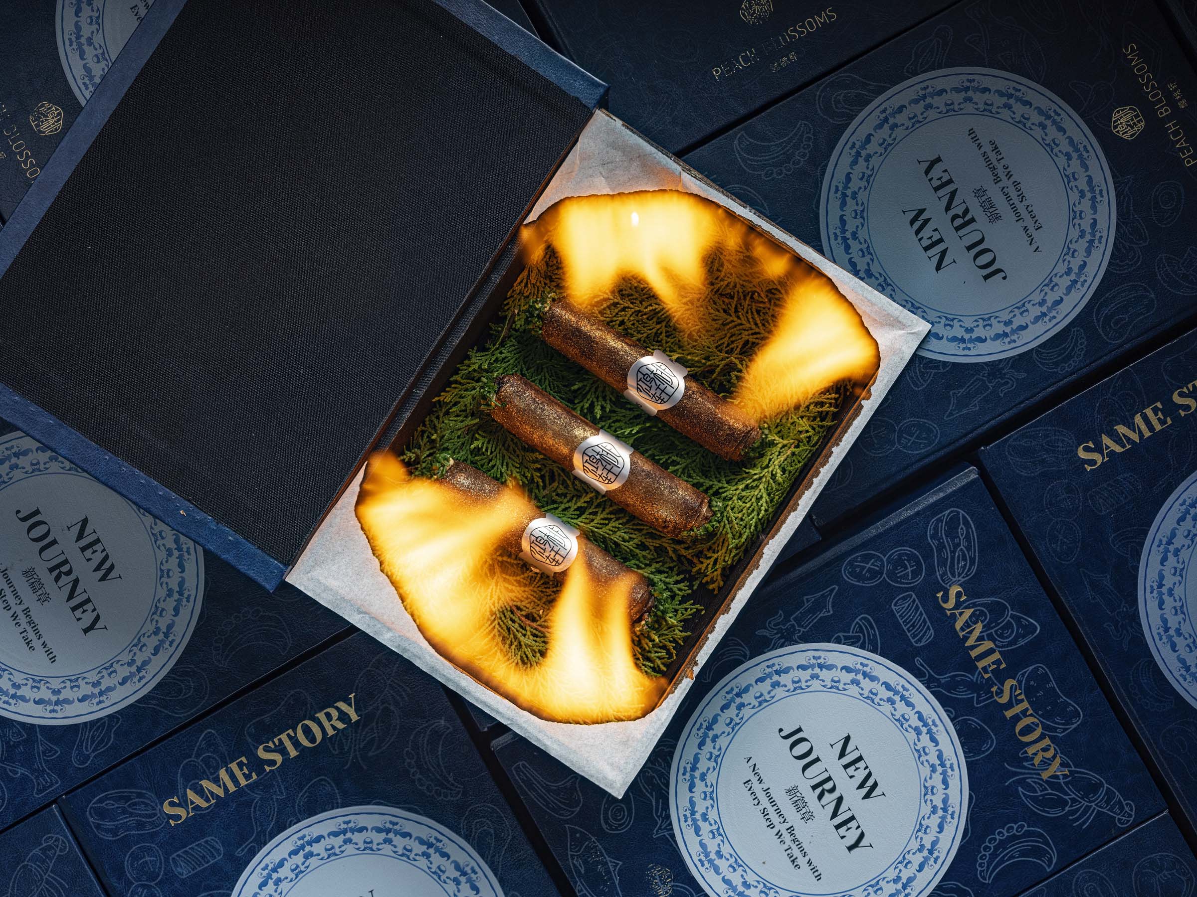The dish features a set of spring-rolls delivered in what appears to be a hardcover book. When it is opened there is a single sheet of paper conceiling it’s contents. The waiter, or waitress will then touch the paper with a lit match and POOF! The paper ignites and bursts into a bright, very quick flame and the contents of the box are then revealed.