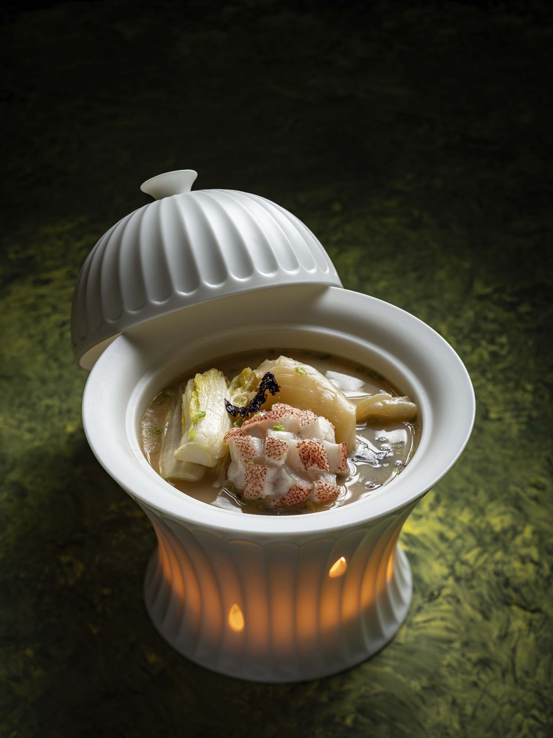 Double Boiled Hydrangea, Coral Trout with Chinese Yellow Wine, Fish Maw, and Cabbage Roll.