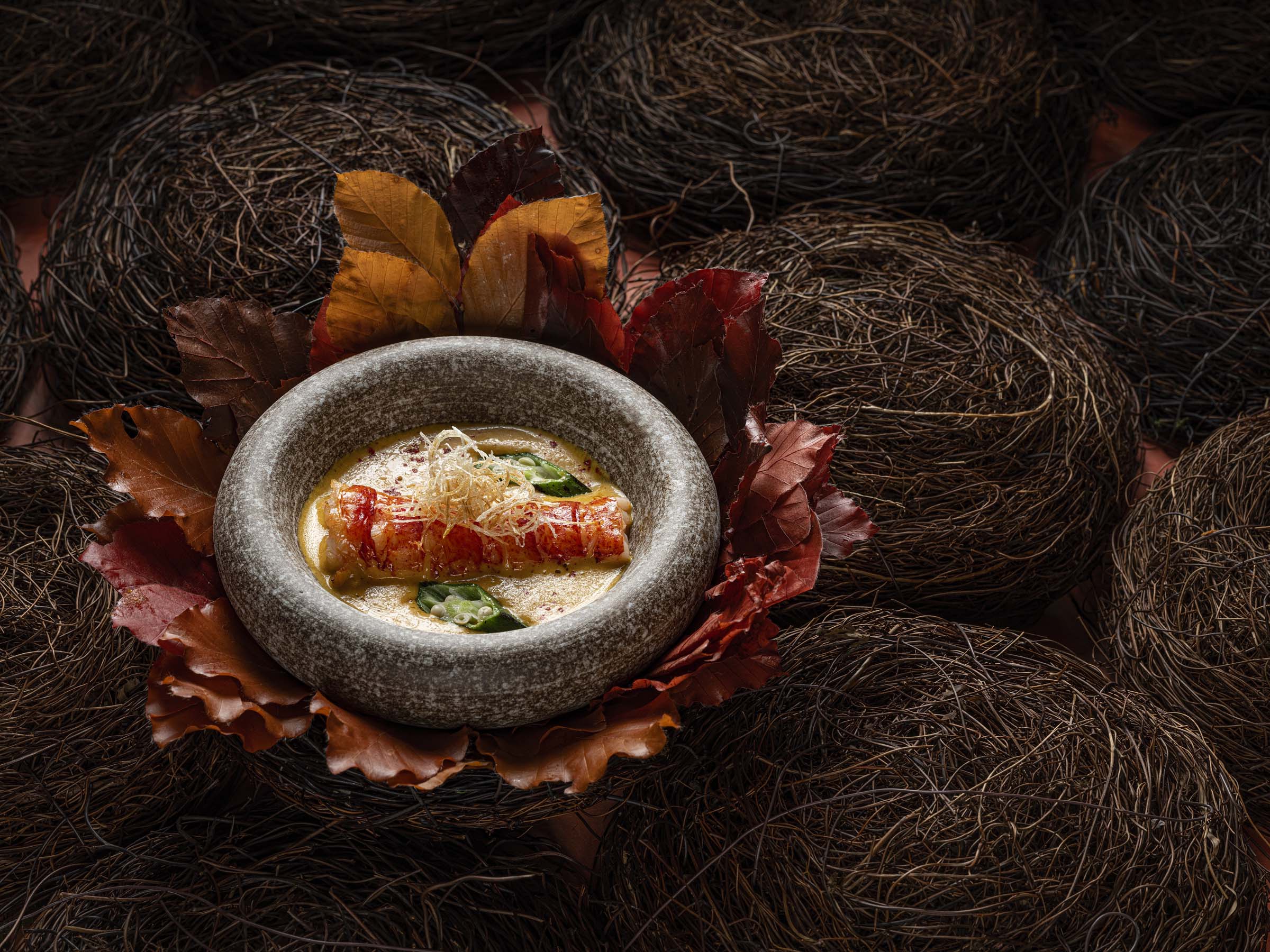 Braised Mung Bean Noodles in Crab Roe Collagen, served with Crab Claw stuffed with Prawn Mousse.