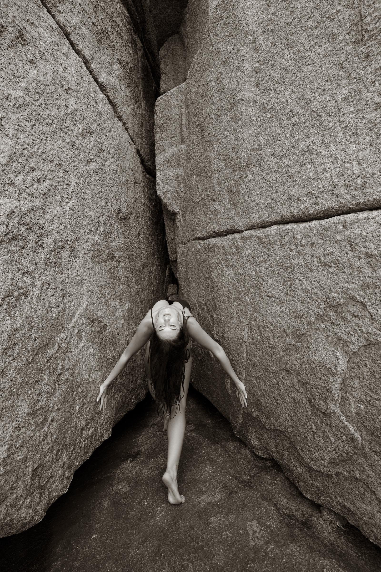 Our second location was on the rock formations along the coast near Hac Sa Beach on Coloane Island. It’s a wonderful string of large boulders which protect the shoreline and offered us a variety of places to choose as our backdrop. In the image above and the following images we chose to work in a small alcove just near the water. This gave Chloe the opportunity to incorporate the stone into some of her poses while providing me wonderful textures and compositional elements to work with.